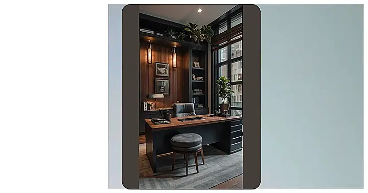 This office is super stylish, right? It’s got all the cool features, like a big desk that looks like it could be in a spy movie, and a fancy lamp that probably costs more than my entire wardrobe. But look at those little wooden drawers! They’re like secret hiding places for all the important papers, making them seem like super secret agents on a mission. Just picture the papers whispering to each other, “Shhh! Don’t let the boss find us!”