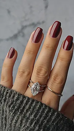 This hand is rocking some seriously stylish gel nails! They’re a deep, rich burgundy color that’s almost like a jewel tone. It’s like they’re ready to walk the red carpet, except maybe the red carpet is made of velvet, not red… you get the picture! And with that big, sparkling diamond ring, this look is totally glam. You could totally picture someone like this owning a fancy car and a big house, right? It’s just oozing confidence and style.