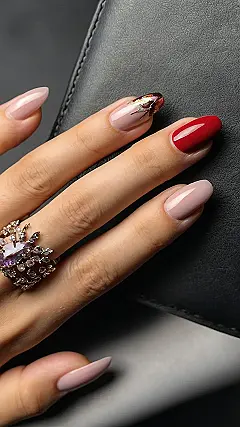 These nails are giving us major fall vibes! With a mix of soft nudes and a bold red, it’s like a pumpkin spice latte and a warm apple pie had a baby. Plus, that sparkly accent nail with the golden flecks? It’s like the shimmering leaves falling from the trees. This manicure is perfect for celebrating everything about fall, from the cozy sweaters to the pumpkin patches. It’s a look that’s both stylish and fun, just like the season itself.