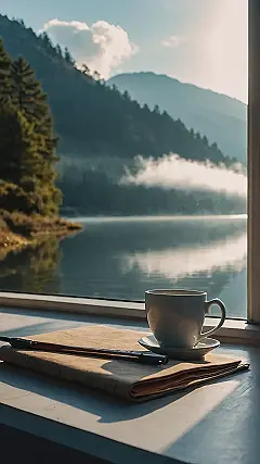 This picture makes me want to grab a cozy blanket and curl up by that window! Imagine waking up to that beautiful view every day – mountains, a calm lake, and just a hint of fog hanging in the air. It’s like a scene straight out of a fairytale! The sunlight is making the water sparkle, and it’s so peaceful you can almost hear the gentle breeze whispering through the trees.