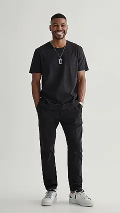 This guy is rocking a classic look that’s perfect for any occasion, from hanging out with friends to grabbing a bite to eat. Black is always a good choice, and this outfit is a prime example. He’s got the basics down: a comfy black tee, some sleek black pants, and cool white sneakers. The only thing missing is a good playlist to jam out to!