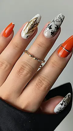 These nails are screaming “Halloween” in the best way possible! They’re edgy, they’re cool, and they’re totally not your average pumpkin-spiced latte. We’ve got sparkly white, spooky black silhouettes, and a pop of orange that’s sure to turn heads. Imagine these nails with a cute black dress or a spooky sweater – you’ll be the most stylish ghoul at the party!