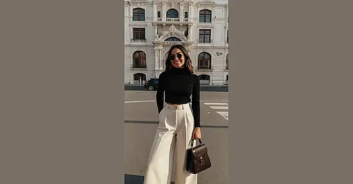 This outfit is giving us major “sophisticated yet casual” vibes! The wide-leg trousers are like a comfy hug for your legs, and the black turtleneck is the perfect way to show off your cool and confident personality. You know that feeling when you put on an outfit and feel like you can conquer the world? Yeah, this is that outfit.