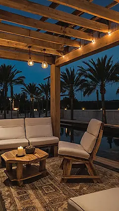 This picture is like a postcard from a chill, relaxing getaway. Imagine yourself sitting in one of those comfy chairs, surrounded by palm trees and twinkling lights. The air smells like summer nights and the gentle breeze rustles the leaves. You can almost feel the sand between your toes and hear the soft waves crashing in the distance!