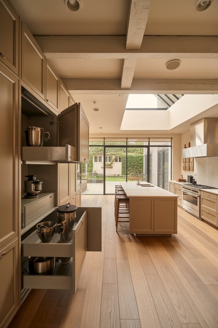 Warm taupe wooden flooring grounds this sophisticated space, while skylights ideas and hallway concepts bring abundant daylight inward. From the back garden glazing to the hidden fridge, every element balances exceptional function with refined form.
