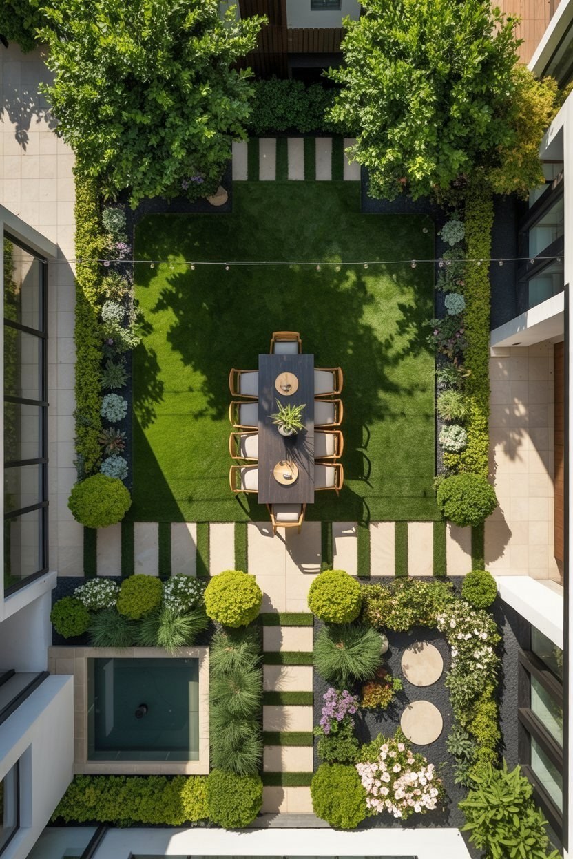 Transform your modern backyard with these inspiring Mediterranean garden design ideas. Geometric lawn panels and pale stone pathways guide you through a landscape rich in texture, featuring clipped hedges and vibrant perennial borders.