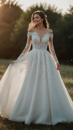 Check out this bride absolutely owning her moment in a breathtaking wedding gown! That dress, with all its beautiful lace and long sleeves, looks like it was woven from sunshine and pure happiness. You can almost hear the soft swoosh of the skirt as she moves, probably practicing her grand entrance or just trying to avoid stepping on a rogue twig. Who needs a red carpet when you’ve got golden hour lighting and a gown that makes you look like a total queen? Just try not to trip!
