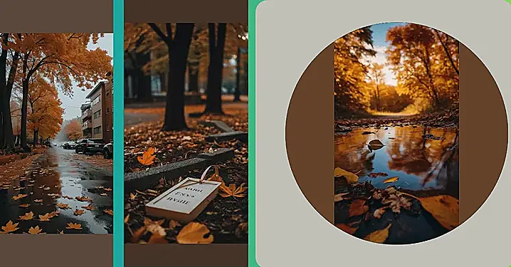 This photo screams “Fall vibes” with a splash of rain! Imagine walking along a street lined with beautiful trees, the air crisp and cool, and the ground covered in leaves. You hear a few raindrops and the rustle of leaves under your feet, all while the golden light of the setting sun bathes everything in a warm glow. It’s like a cozy autumn dream!