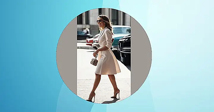 This lady is rocking a classic white dress with some seriously stylish details! It’s like she stepped right out of a magazine. The double-breasted design and those big, shiny buttons make it look super fancy, but the dress is still simple enough to wear anywhere. Plus, with those gorgeous heels, she’s ready to turn heads wherever she goes.