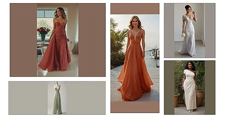This stunning burnt orange number looks like it was made for dancing the night away at a fabulous beach wedding! Picture yourself gliding across the wooden pier, maybe dodging a tipsy uncle’s enthusiastic dance moves, all while looking effortlessly chic in this flowing gown. It’s got that “I’m here for the happy couple AND the open bar” vibe, striking the perfect balance between fancy and fun. Plus, that rich color is totally giving main character energy without, you know, actually being the main character (that’s the bride, obviously!).