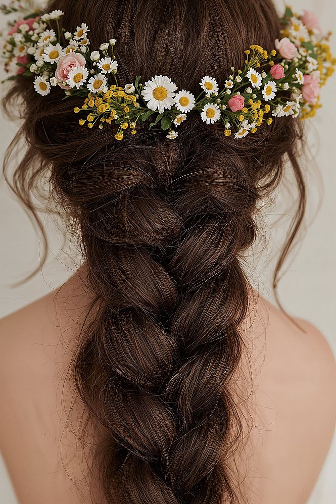 Discover ethereal bridal hair inspiration with this stunning floral wedding crown intertwined with a delicate braid. The rich brown tones and varied floral hues create a captivating garden hairstyle.