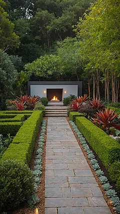Then you hit the jackpot: an actual fireplace, outside, just chilling in the middle of all that green goodness! Forget chilly evenings, you could totally roast marshmallows out here or just scroll through TikTok without fear of a cold nose. Those reddish-orange plants next to it look like they’re having a party too, probably discussing how fabulous they look. This garden is basically saying, “Come relax, we’ve got the ambiance and the warmth, just bring your own snacks.” It’s like someone took all the best parts of a cozy living room and a vibrant forest and made them best friends in this ultimate dream garden.