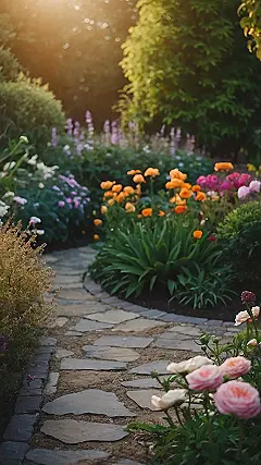 The image shows a charming garden path, winding through a symphony of colors. It’s like a secret passage leading to a magical land! The warm light of the setting sun makes the scene look even more dreamy, bathing the stone path in a golden glow. You can almost imagine yourself taking a step on those smooth stones and being whisked away to a world of wonder and imagination.