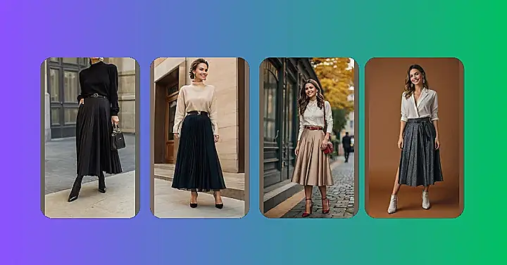 This outfit is like a fancy party for your legs! You’ve got a cozy, comfy sweater on top, keeping you warm from the chilly autumn air. And then you’ve got a skirt that’s like a million tiny pleats gathered together, ready to take on the world! It’s basically a skirt that’s like a giant, stylish hug for your lower half. You can even add a cute belt to make the outfit even more awesome! This look is perfect for when you wanna feel stylish and put-together, but still want to be comfortable enough to tackle whatever the day throws at you. It’s like the best of both worlds!