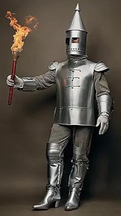 Imagine trying to walk in those boots, though! The Tin Man might be strong, but he’d need some extra oil to get going in those high heels. Just think, this Tin Man could be the life of the party with his trusty torch and his shiny armor. He’s got that “I’m ready for anything” look and a fire in his eyes that’s hotter than a summer sun!
