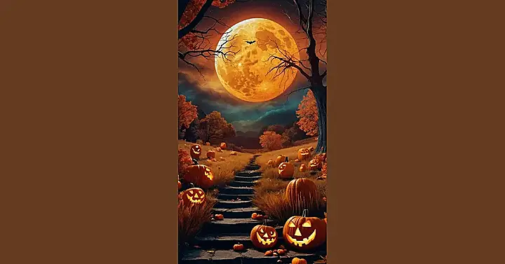 This picture is perfect for a Halloween wallpaper background! Imagine you’re walking through a dark, spooky forest under a giant, glowing moon. The path ahead is lined with jack-o-lanterns with their scary faces lit up, as if they’re trying to scare you. The whole scene is mysterious and fun, like something out of a Halloween story!