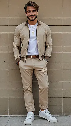 This guy knows how to rock smart casual! He’s got the perfect blend of dressed-up and laid-back with his beige pants and brown bomber jacket. It’s like he just stepped out of a fashion magazine, except he’s not afraid to wear white sneakers. He’s telling everyone that he’s comfortable in his own skin, but also knows how to look good while doing it.