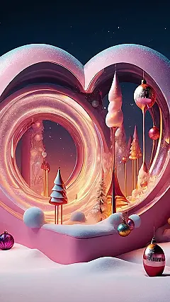 This Christmas, it’s all about the pink! Imagine a snow-covered landscape with a giant heart-shaped frame around it, like a magical picture. Inside the frame, the snow is sparkly and everything glows with a soft, warm light. The trees are a little strange – some are tall and skinny, and some look like they’re made of candy! It’s like a Christmas scene straight out of a dream, and it’s just waiting for you to step into the picture.