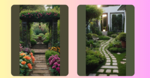 This image is like a picture from a dream! It looks like someone took a bunch of tropical plants, threw them in a blender with some awesome design ideas, and poof! – this incredible landscape popped out! There’s a house with a porch that’s begging you to come relax, but the real star of the show is the mini-pond with the bright pink flowers blooming. It’s like something out of a fairy tale, but it’s real!