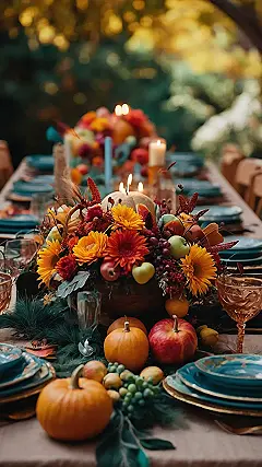 This table is super festive. It’s got everything: warm colors like yellow and orange, lots of yummy-looking fruit, and even candles for that special touch. Plus, the blue plates are a nice contrast to all the warm tones. Maybe the blue plates are a reminder that the turkey’s gonna be juicy, but maybe it’s just a cool color choice. Whatever the reason, this table looks like a great place to be on Thanksgiving!