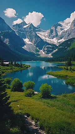 This picture is like someone took a screenshot from a super-chill anime movie! Imagine a tiny anime character, maybe a magical girl or a stoic samurai, peacefully gazing at this breathtaking view. It’s the kind of landscape that would be the perfect backdrop for a quiet moment of reflection, a dramatic showdown, or maybe even a whimsical tea party with woodland creatures. Seriously, just picture it: Fluffy clouds drifting over jagged, snow-capped peaks, a crystal-clear lake reflecting the mountains like a mirror – it’s almost too perfect to be real!