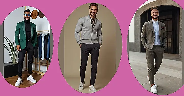 That guy’s got style! He’s rocking a seriously cool casual look – a comfy grey zip-up jacket, sharp pinstripe pants, and clean white sneakers. It’s like he just stepped out of a fashion magazine, but also looks ready to chill with friends. See? You don’t need a tuxedo to look awesome. This outfit is all about that perfect balance of relaxed and refined— proving that casual can still be seriously stylish. It’s the kind of outfit you can wear to a coffee date, a casual hangout, or even a relaxed family dinner.