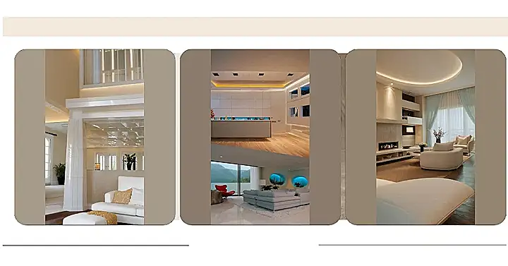 This living room is so fancy, it looks like it’s floating on a cloud! The ceiling is all shiny and white, like a big, fluffy marshmallow, and the light bounces off it like sunshine. The couch looks super comfy, and you can almost hear the sound of “relaxing” as you sink into it.
