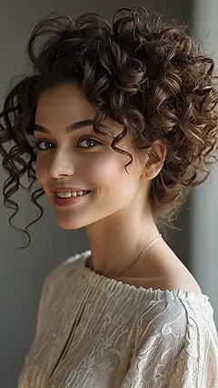 Have you ever looked at a perfectly styled updo and thought, “Wow, I wish my hair could do that?” Well, guess what? Even if you’ve got curly hair that’s as wild as a lion’s mane, you can still achieve a sleek and chic updo! This beautiful lady is rocking a messy bun that’s totally on-trend. It’s like she took a handful of her curls and whipped them into a work of art, and it looks super sophisticated without being too stiff or boring. Plus, she’s giving off major “I’m ready to take on the world” vibes with that confident smile.