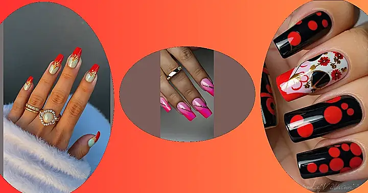These nails are seriously awesome! Look at those bold red polka dots on a sleek black background – it’s like a super stylish ladybug landed on each finger! And then there’s that other nail, all fancy with pretty red flowers and gold accents. It’s like a tiny, wearable garden party! It just goes to show, “hot nail designs” don’t have to be boring; they can be playful and totally unique.