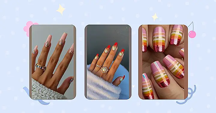 Seriously, these “hot nail designs” are so cute, they almost make me want to start painting my own nails (almost!). The pink base is super sweet, and those gold stripes? They’re like tiny little pieces of sunshine. And that sparkly red at the bottom? It’s the perfect finishing touch, like a delicious cherry on top of a summery sundae. These nails are definitely going straight to my inspiration board – maybe I’ll try to recreate them… someday!