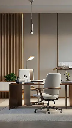 The image shows a modern office space with a sleek desk, comfy chairs, and a minimalist vibe. It’s like stepping into a magazine for grown-ups! The soft lighting and neutral colors create a calming atmosphere, perfect for focusing on your tasks without getting overwhelmed. It’s a far cry from the cluttered desks and flickering fluorescent lights of your typical high school classroom!