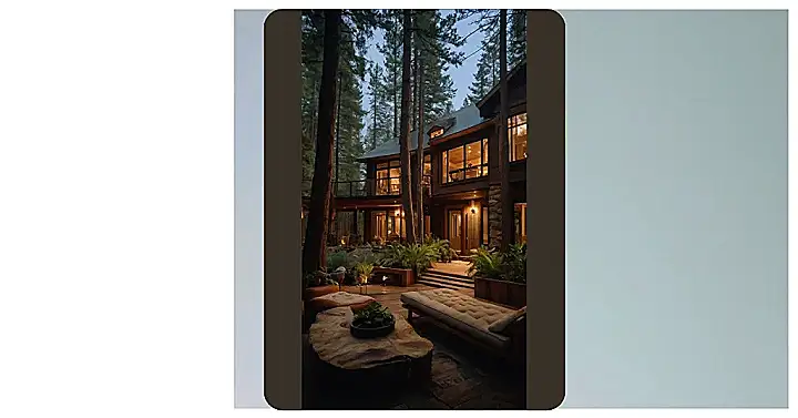 Imagine walking into this living room. The first thing you’d see is a giant window that makes you feel like you’re in a treehouse, surrounded by nature. It’s like the outside world is reaching into your home, bringing in all those fresh vibes. The couch looks comfy enough to sink into with a good book, and the huge, rustic coffee table looks like it was carved from a giant tree trunk. It’s like stepping into a forest, without having to deal with bugs or mud.