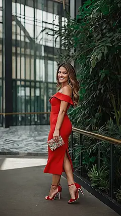 This woman looks absolutely stunning in her red dress! It’s like she stepped straight out of a magazine, and her smile could light up a room. She’s got that confident, “I’m ready for anything” vibe going on. And those golden heels? They’re the perfect touch to complete her look. It’s like she’s saying, “I’m not just dressed up, I’m ready to take on the world!”