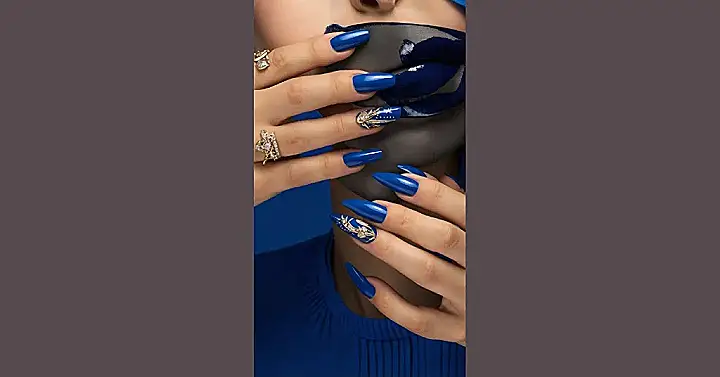 Getting your nails done can feel like a superpower upgrade, right? These blue nails in the picture totally look like they belong on someone about to rule the world or at least ace their next test. With those fancy gold sparkly bits on some of them, they’re not just blue; they’re like, *fancy* blue. It’s the kind of nail art that makes you want to wave your hand dramatically or point confidently at things, maybe even at the last slice of pizza.