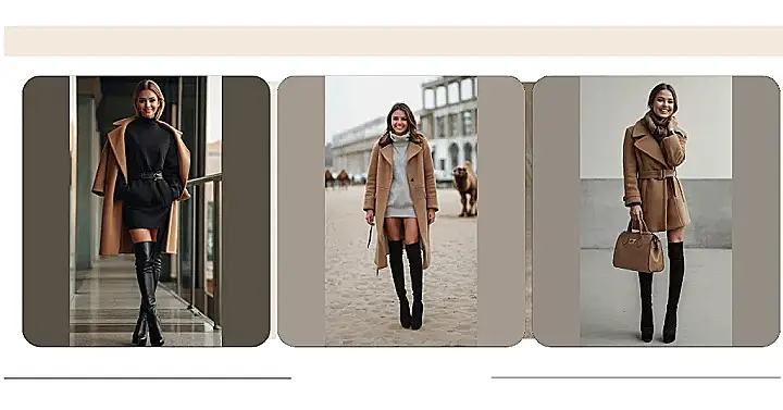 This picture shows a woman rocking a camel coat – seriously, it’s like she’s stepped out of a fashion magazine! The coat is super stylish and the color is perfect for fall or winter. Paired with those amazing over-the-knee boots, she’s totally nailed the “women camel coat outfit” look. It’s the kind of outfit that makes you want to grab a latte and stroll through a Parisian street (even if you’re just walking to school!).