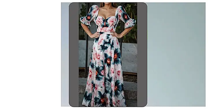 This dress is like a garden party exploded all over a beautiful canvas! It’s got those puffy sleeves that scream “I’m ready for a fancy day out” and a floral print that’s like a whole bouquet just got dropped on the fabric. You know, the kind of dress that would make you feel like a princess strolling through a European park in the fall, maybe even stopping for a picnic with a handsome prince!