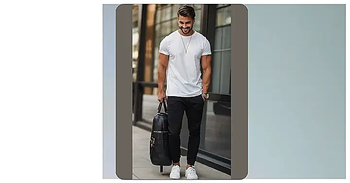 This guy’s rocking a classic men’s t-shirt outfit that’s perfect for just about anything! A simple grey t-shirt is the foundation, and he’s paired it with comfy black pants that have a cool gold stripe. It’s like he’s saying, “I’m ready for anything, from hanging with friends to hitting the gym.” He’s got a cool necklace and a watch too, showing he’s got style even when keeping it casual.