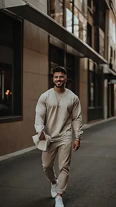 This guy’s got the “I’m cool and comfortable” vibe going on with his casual t-shirt and sweatpants outfit. Think of it like your favorite comfy pajamas, but way more stylish! He’s rocking a simple, light-colored tee and matching pants – it’s a classic combo that never goes out of style. Plus, his chill vibe is totally contagious! Just picture yourself walking down the street looking effortlessly cool like him, ready to take on the world in style!