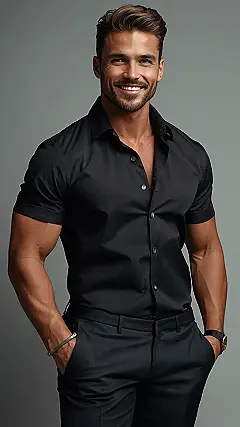 This Valentine’s Day, ditch the sweats and unleash your inner James Bond! This guy’s got the perfect outfit for impressing your date – a sleek, dark shirt and pants combo that screams sophistication without being stuffy. Think less “Netflix and chill,” more “candlelit dinner and maybe some dancing.” He’s clearly ready for a night out, maybe even a romantic drive in his fancy car (who needs a bouquet of roses when you’ve got this?).