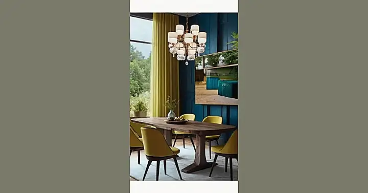 This picture is seriously giving me major home makeover envy! Just imagine: you’re finally getting to choose your dream home wallpaper, and you see this gorgeous dining room. The rich teal walls are like a calming ocean, and those sunshine-yellow chairs? They’re practically begging you to throw a party (or maybe just relax with a good book and some yummy snacks). The whole thing feels so sophisticated, but also comfy and inviting – like the perfect place to spend a rainy afternoon.