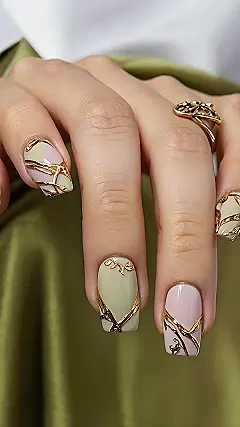 Look at these nails! They totally decided that being “nude” didn’t mean being boring. It’s like they started out super chill, maybe just hanging out in comfy beige or dusty pink, and then suddenly remembered they had a fancy party to attend. So, they threw on some serious gold accessories, weaving and twisting around like tiny golden vines trying to escape a jungle of fabulousness. They probably think they’re too good for basic glitter now.