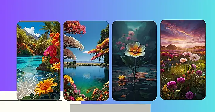 Imagine if Bob Ross decided to paint the Sims world after drinking a smoothie made of rainbows! This flower landscape wallpaper is like a glitch in reality, where nature’s colors went wild and decided to throw a party. The trees look like they’re wearing cotton candy wigs, and the water is so clear, you could probably see a tiny, confused goldfish waving back at you.