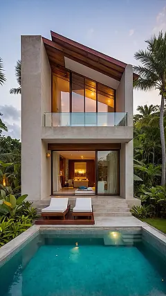 Picture this. You know those houses that look like they belong in a movie? This modern tropical pad is definitely one of them. It’s so tall, you could probably high-five a passing cloud (if clouds had hands). And those giant windows? Perfect for dramatically staring out at the palm trees while pretending you’re in a music video, instead of, you know, doing math homework. It basically screams “fancy vacation mode activated” and looks like the ultimate upgrade from your average study spot.