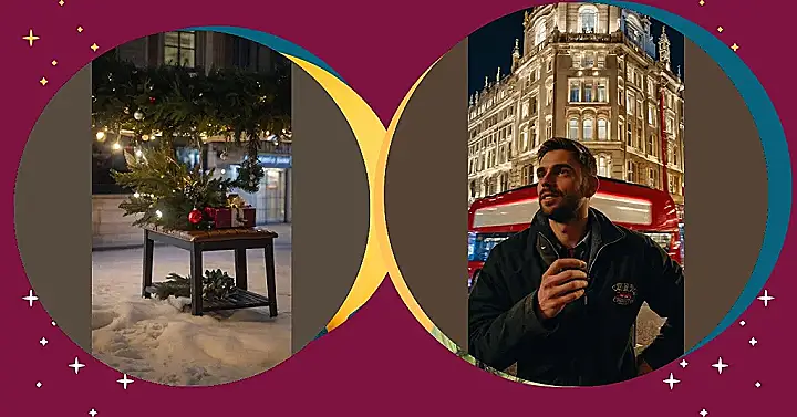 Imagine this: you’re in London, the city is sparkling with Christmas lights, and a red double-decker bus whizzes past, blurring into a festive streak of crimson. That’s the kind of magic you’ll find during Christmas in London! Our guy here looks like he’s already found his favourite spot, maybe grabbing a warm drink to ward off the evening chill while soaking up the festive atmosphere. He’s clearly enjoying the dazzling lights and the unique buzz of London at Christmastime. It’s like a postcard come to life – but way more fun!