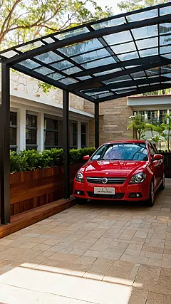 Check out this awesome modern car porch! It’s like a fancy, super-stylish carport for your ride. That sleek, black metal frame and the clear roof keep your car safe from the sun and rain, but also lets in all the sunshine so you can show off your car’s color. It’s practically begging for a convertible to park under it! Plus, that red car looks like it’s ready for a road trip to somewhere super cool.