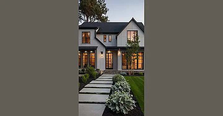 This house is seriously stylish! It’s like a modern farmhouse decided to upgrade its look with sleek black accents and huge windows. Imagine having all those big windows letting in tons of sunshine – perfect for lazy weekend mornings! It’s the kind of place where you could totally picture yourself having a movie marathon with your friends, maybe with popcorn and pizza on the stone walkway leading up to the front door. Seriously though, who wouldn’t want to live in a house this cool?