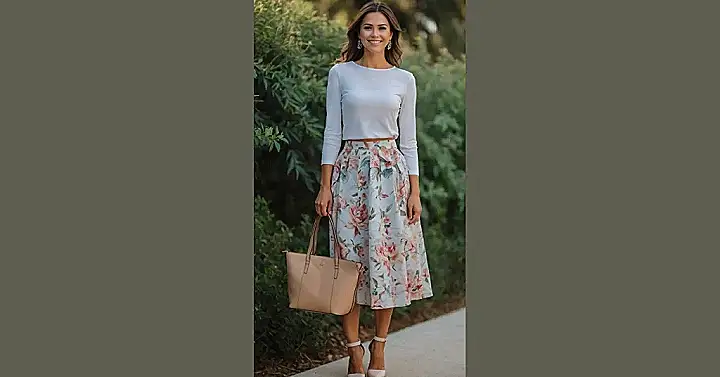 This outfit looks so classy and comfy all at the same time! The floral skirt is totally giving off picnic-in-a-park vibes, while the plain white top keeps it simple and chic. It’s proof that you don’t have to spend a fortune to look amazing – you might even have pieces in your closet right now that you can mix and match! Just add your favorite accessories, like a cute bag or some sparkly earrings, and you’re ready to conquer the day!