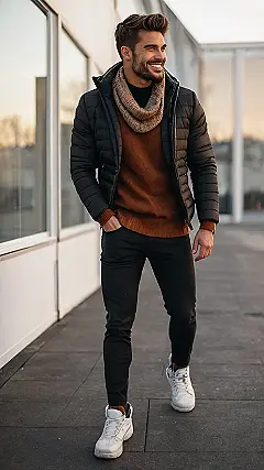 **Paragraph 1:** Hey, check out this guy! He’s totally rocking the winter streetwear look. Forget bulky parkas – this puffer jacket is sleek and stylish, perfect for those chilly days. That burnt orange sweater underneath is a seriously cool color choice, and the scarf adds a touch of cozy sophistication. He’s clearly not afraid to mix and match textures and colors to create something unique. White sneakers? Genius move! It breaks up all the dark colors and makes the whole outfit pop.