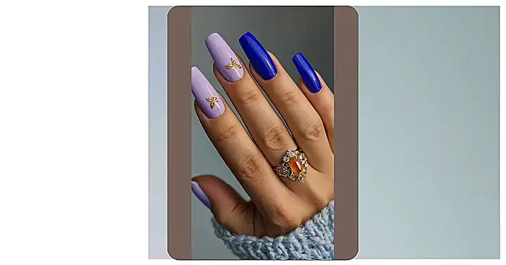 These nails are totally rocking the “Blue Valentine’s Day” look! Imagine getting these done for a special date, or even just to treat yourself because you deserve it. That gorgeous mix of periwinkle and electric blue is like a fancy night out meets comfy sweater weather. The tiny gold butterflies are the perfect touch—so cute and delicate, it’s like a secret message only your nails know!