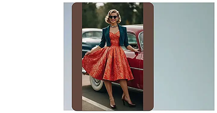 **Paragraph 1:** Wowza! Check out this amazing retro look! This lady is totally rocking a vintage vibe with her mustard-yellow dress – it’s like something out of a 1950s movie! That red jacket is the perfect pop of color, and those shoes? To die for! Imagine her cruising down Main Street in a convertible, sunglasses perched on her nose, feeling like the ultimate queen. I bet she knows all the words to “Rock Around the Clock”! The whole scene, from the dress to the amazing retro-looking bar behind her, is pure style.